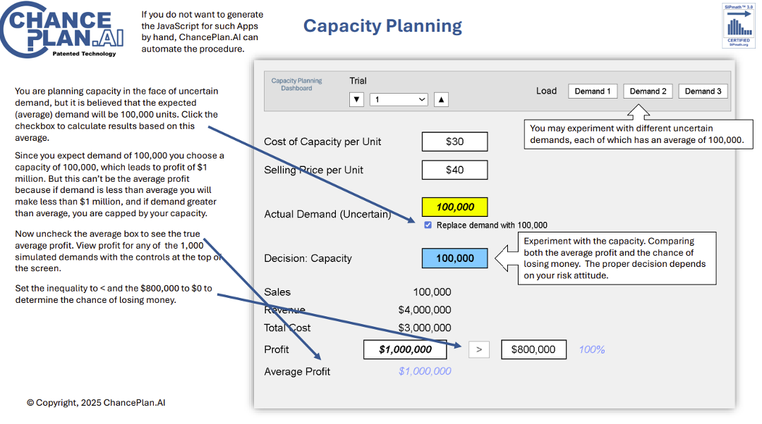 Recently, aided by advances in Artificial Intelligence, I founded ChancePlan.AI to commercialize applications of the SIPmath Standard. In particular, we have focused on developing Web Apps that run directly in the browser with nothing but JavaScript. This is a low powered computational environment, in which it would be difficult to develop complex simulations. But using the SIPmath Standard, the heavy number crunching gets performed elsewhere and is delivered to the Web App, much as electricity generated in a distant power plant is delivered to your light bulbs and dishwasher using the 60 Cycle Alternating Current Standard. This puts the benefits of Monte Carlo Simulation within reach of the 5.5 billion people on the internet.